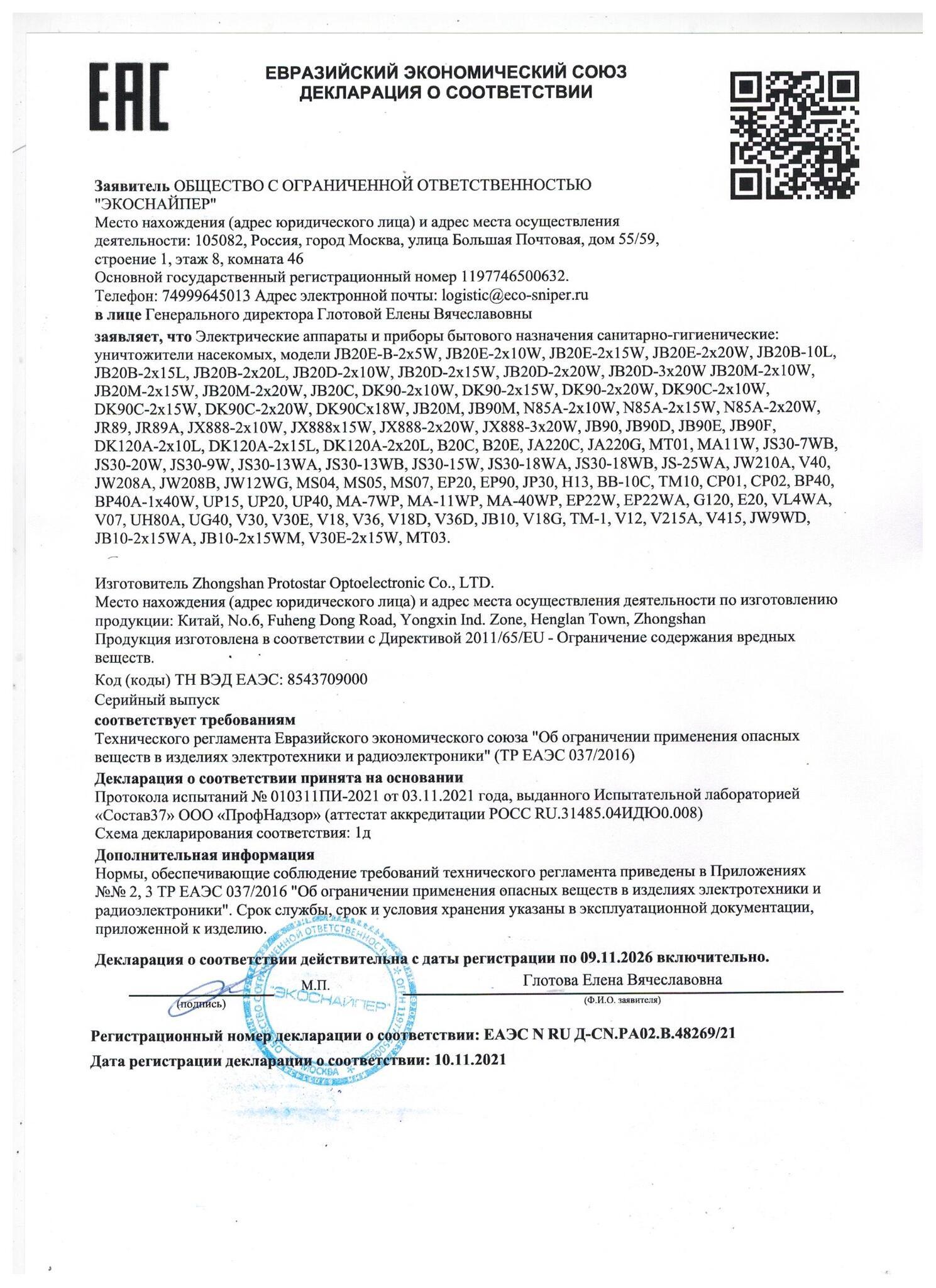 Приобрести лампу от комаров "Экоснайпер JB20C" в Сысерти можно, оформив заказ на нашем сайте. Экоснайпер JB20C: цена, отзывы, подробное описание.