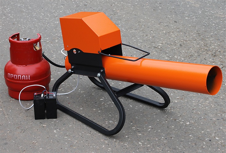 - Экономное потребление газа. Устройство потребляет газ очень экономно — 10 кг пропана хватает на 17 тысяч выстрелов. При интервале 30 минут пушка сможет работать от одного баллона 27 л почти целый год.